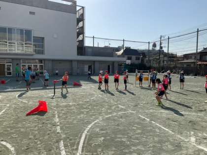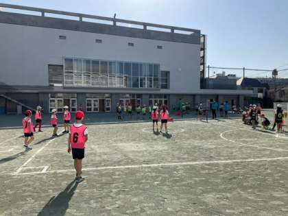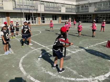 体育の時間です。Tボールの試合です。バットスウィングにスピードが出てきました。