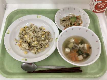 献立 野沢菜チャーハン、ひじき入りナムル、中華スープ、牛乳