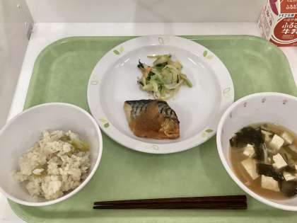 献立 さつま芋おこわ、さばのおろしポン酢がけ、白菜のお浸し、えのきのみそ汁、牛乳