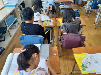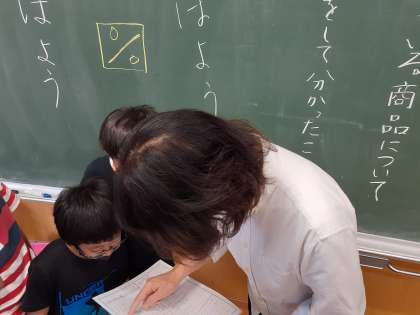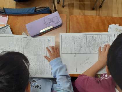 社会の時間です。スーバーマーケット見学のことや学習したことを基に新聞を書いています。