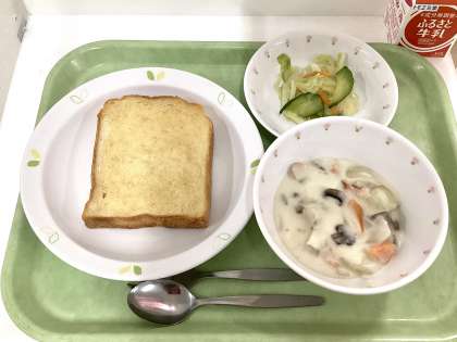 献立 メープルトースト、サーモンクリームシチュー、野菜のドレッシングかけ、牛乳