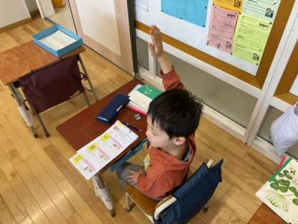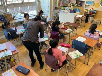 国語の時間です。漢字の学習に取り組んでいます。右はらい、左はらいに気をつけて書いています。