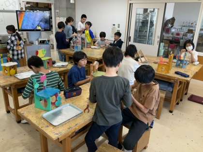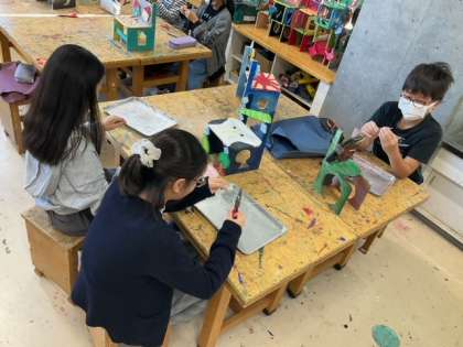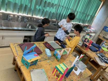 図工の時間です。すてきな椅子が完成しています。発想がすごいですね。