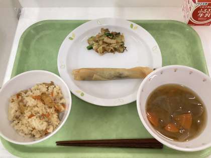 献立 子ぎつねご飯、ししゃものパリパリ揚げ、白菜のおかか和え、五目みそ汁、牛乳