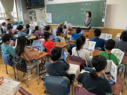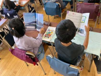 音楽の時間です。「ふじ山」を合唱しています。曲の山を考えながら、抑揚をつけて歌っています。