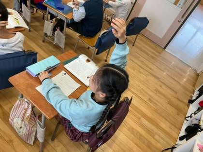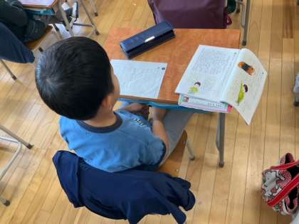 国語の時間です。「しらせたいな、見せたいな」絵を見て、見つけたことを書いていきます。