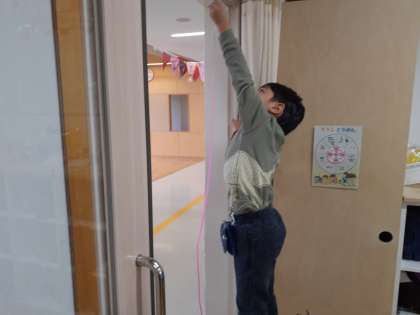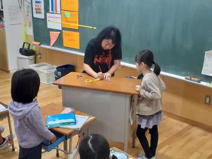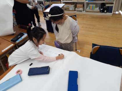 算数の時間です。教室にある動かないものの長さを調べて、比べました。班で協力して調べました。