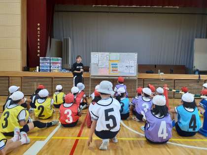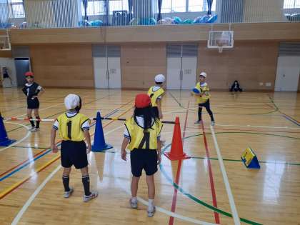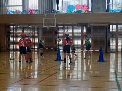 体育の時間です。プレルボールの最後の授業です。作戦をたて、チームで一点でも多くとれるよう頑張りました。