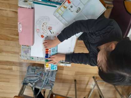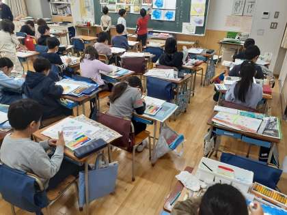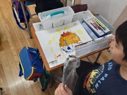 図工の時間です。「大きく育てびっくり野菜」をテーマに絵を描きました。想像力豊かに描いていました。