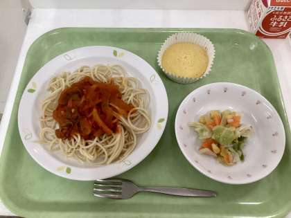 献立 トマトクリームスパゲッティ、コーンサラダ、ぐりとぐらのかすてら、牛乳