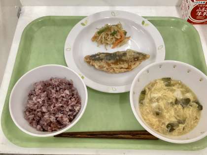 献立 古代米ご飯、あじのピリ辛ソース、もやしのごま酢和え、卵とコーンの中華スープ、牛乳