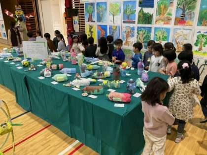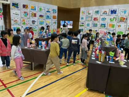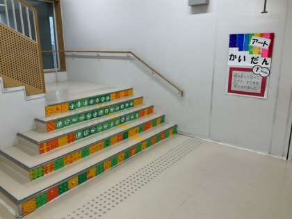 1年生が鑑賞しています。1年生は、「かいだんアート」を作って、若竹階段を飾りました。