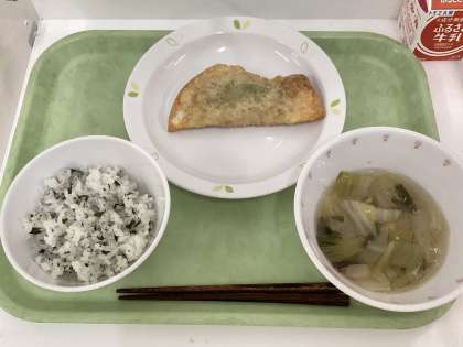 献立 わかめご飯、ジャンボぎょうざ、春雨と白菜のスープ、牛乳