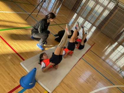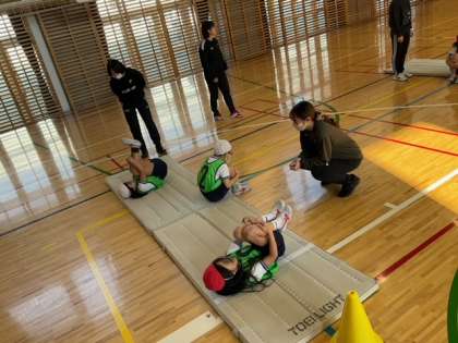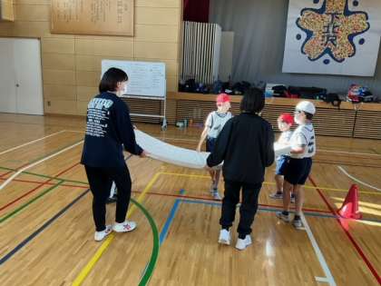 体育の時間です。今日は、日本女子体育大学の須甲先生と学生のみなさんが、マット運動を教えてくださっています。