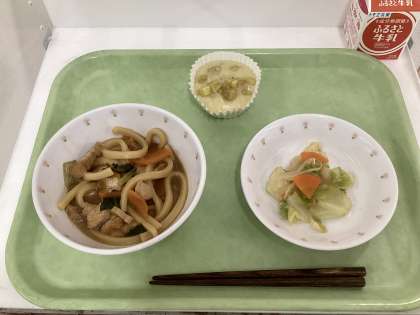 献立 みそ煮込みうどん、キャベツのレモンじょうゆ和え、鬼まんじゅう、牛乳