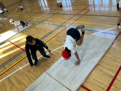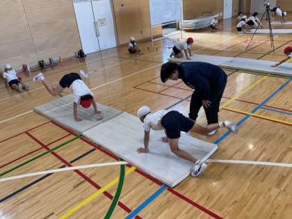 体育の時間です。今日も、日本女子体育大学のみなさんが、マット運動の指導をしてくださっています。身体の使い方のコツを教えてもらいました。