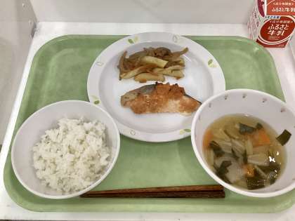 献立 ご飯、鮭のもみじ焼き、じゃが芋のきんぴら、あんかけ汁、牛乳