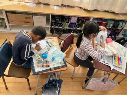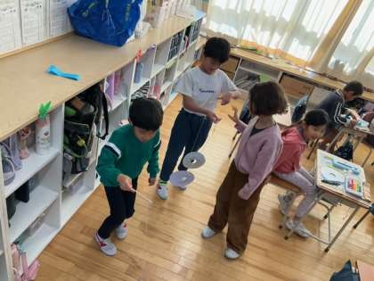 図工の時間です。「ドーナツけん玉」を作っています。友達のけん玉でも遊んでみましょう!