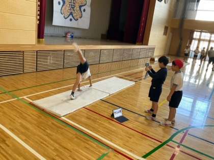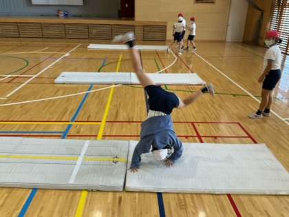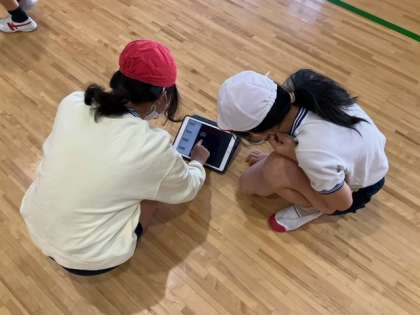 体育の時間です。側方倒立回転に取り組んでいます。iPadで撮影して、技の出来栄えなどを確かめながら練習を進めています。