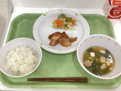 献立 有機米ご飯、鶏肉の味付け焼き、いろどりれんこんサラダ、豆腐のすまし汁、牛乳