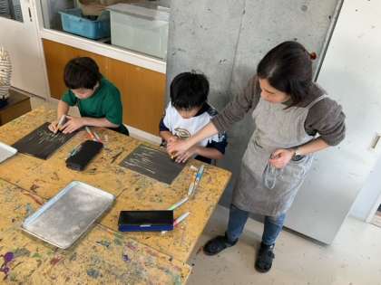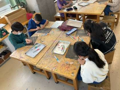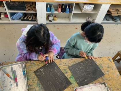図工の時間です。「はじめての彫刻刀」安全に彫れるように練習しています。左手を前に置かないように注意しましょう。