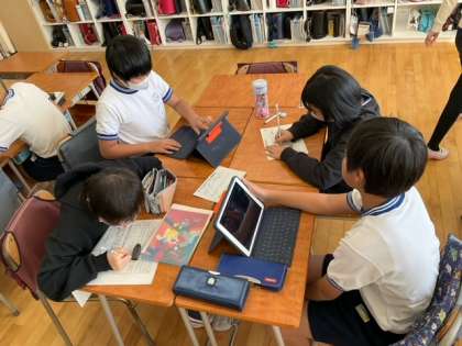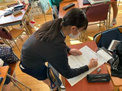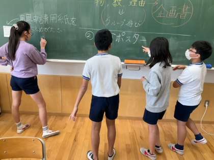 学級活動の時間です。12月8日にキッズフェスタを実施します。6年生はリーダーとして企画・運営を行います。企画書の作成中です。