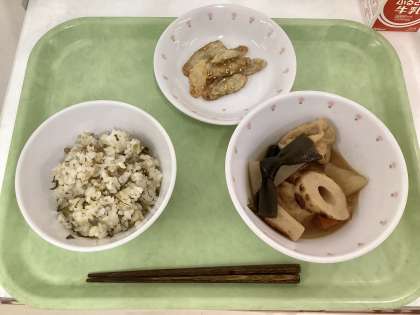 献立 大根葉ご飯、大蔵大根おでん、甘辛ごぼう、牛乳