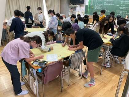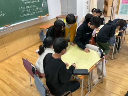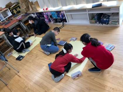 学級活動の時間です。なかよし班キッズフェスタに向けて、遊びを紹介するポスターを制作しています。