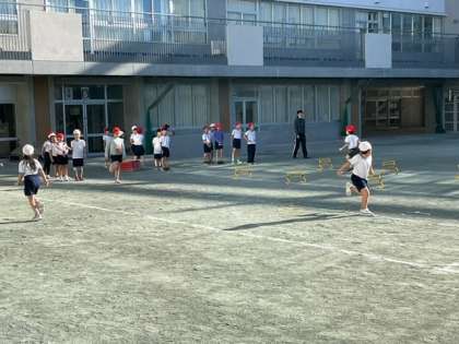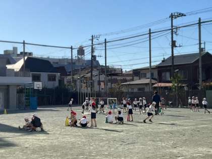 体育の時間です。校庭をいっぱいに使って、いろいろな運動に取り組んでいます。