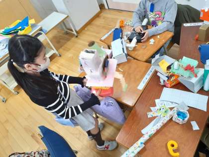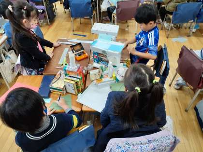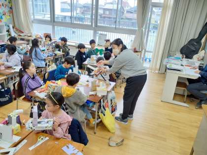 図工の時間です。自分の作品を班のお友達に紹介しました。