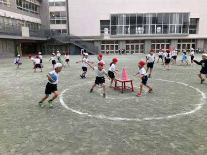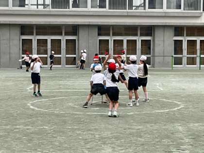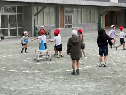 体育の時間です。「まとあてゲーム」に取り組んでいます。縁の中心にあるコーンを倒すことができるでしょうか?