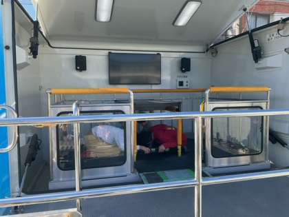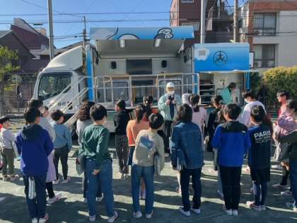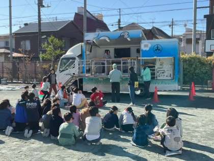 通常の避難訓練のあと、4年生とくるみ学級のみなさんが、起震車体験訓練を行いました。大きな震度を経験する貴重な体験です。