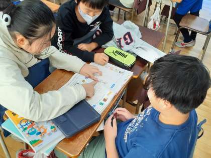 外国語の時間です。スピーキングのチェックをしました。上手に話せるように一生懸命練習しました。