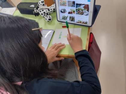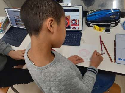 家庭科の時間です。郷土料理を調べて、カードに絵を描きました。