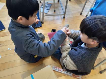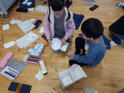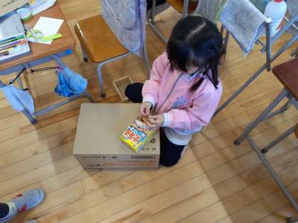 国語の時間です。ものの名まえの学習でお店やさんの準備をしています。