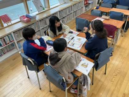 外国語の時間です。「ものの値段」の聞き方と答え方を学習しています。このハンバーガーは、いくらですか?