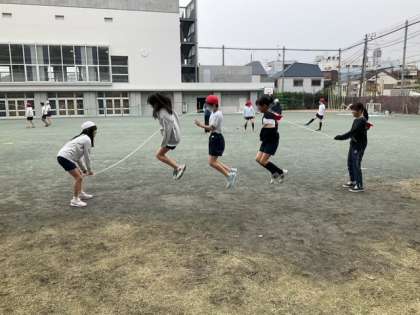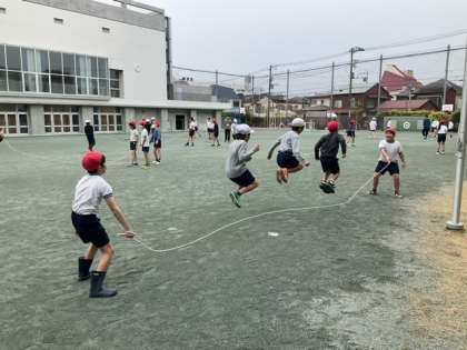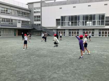体育の時間です。長なわとびに取り組んでいます。グループで工夫しながら、いろいろな跳び方に挑戦しています。