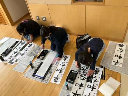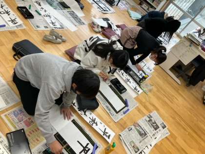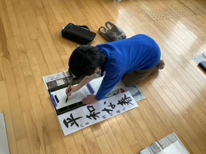 習字の時間です。書き初めの練習をしています。6年生の題字は、「平和な春」です。