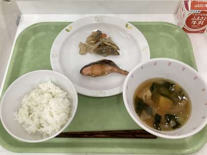 献立 有機米ご飯、鮭のゆうあん焼き、れんこんの塩きんぴら、かぼちゃのみそ汁、牛乳