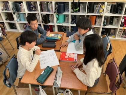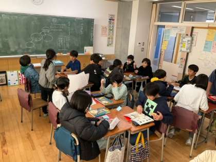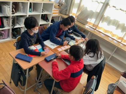 国語の時間です。やなせたかしさんについて書かれた文章を読んで、やなせさんのすごさについて考えています。