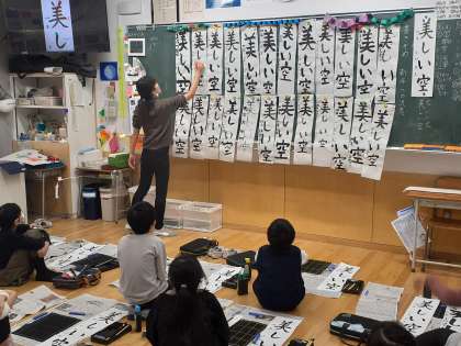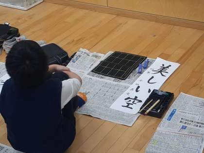 書写の時間です。書き初めの練習をしました。友達の作品を見合って、良いところを見付けました。