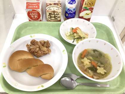 献立 黒砂糖パン、フライドチキン、カラフルサラダ、野菜スープ、セレクト飲み物(牛乳、コーヒー牛乳、ジョア、りんごジュース)