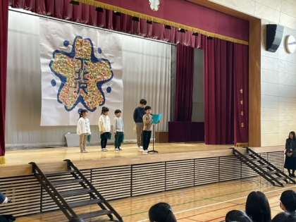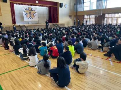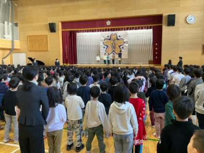 1年生とくるみ学級の代表児童あいさつがありました。生活指導担当の先生からは、交通安全をしっかり意識すること、悩みなどは近くの大人に相談することについて話がありました。