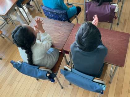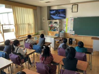 安全指導の時間です。交通安全ビデオを見ながら、冬休みに気をつけることを考えています。