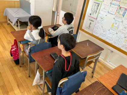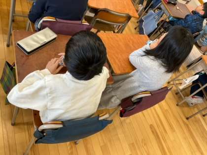 学級活動の時間です。今までを振り返りながら、学級目標をレベルアップしています。