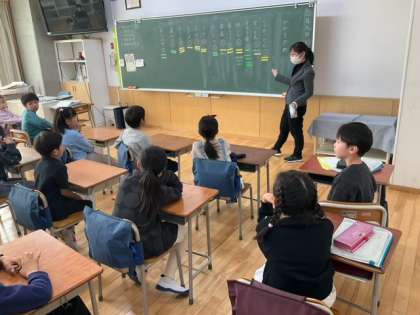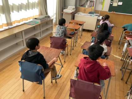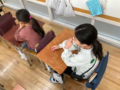 学級活動の時間です。係決めをしています。よりよいクラスにするために、真剣に考えています。