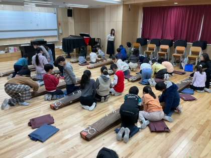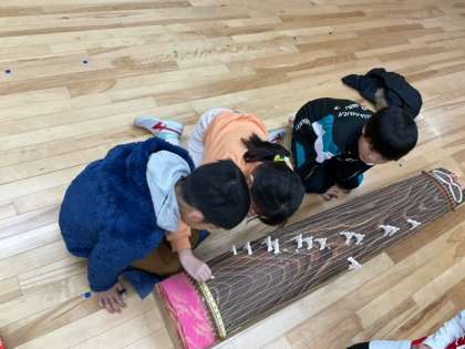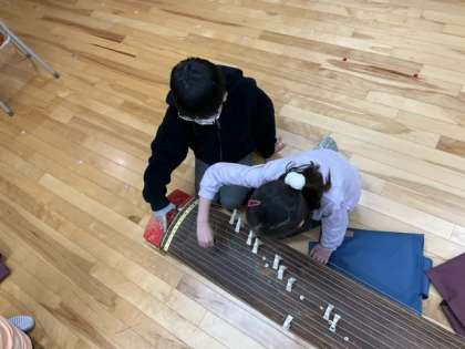 音楽の時間です。琴に挑戦しています。「さくらさくら」のメロディが響いています。