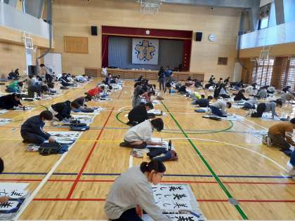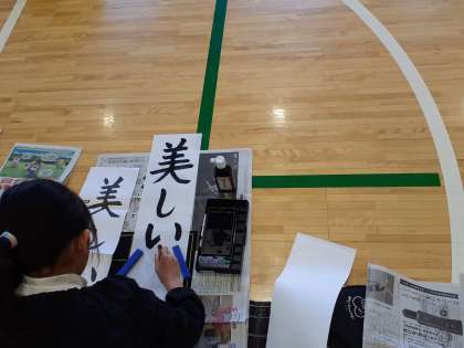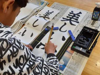 書き初め会の時間です。一画一画を丁寧に書きました。今日の空のような美しい空を想像しているのでしょうか。