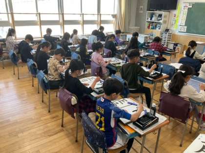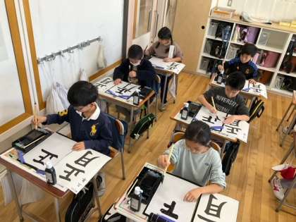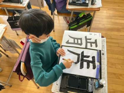 習字の時間です。今日の題字は、「正月」です。筆づかいが身についてきましたね。