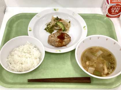献立 ご飯、むろあじバーグ、もやしとわかめの和え物、白菜のみそ汁、牛乳
